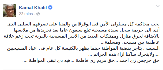 وطالب الناشط اليساري كمال خليل، بمحاكمة كل مسؤولي الأمن في أبو قرقاص والمنيا على تصرفهم الذي وصفه بـ”السلبي الذي أدى إلى جريمة سحل سيدة مسيحية تبلغ سبعين عامًا بعد تجريدها من ملابسها بالإضافة لحرق منازل وممتلكات العديد من الأسر المسيحية بالقرية تحت زعم علاقة عاطفية بين مسيحي ومسلمة”.