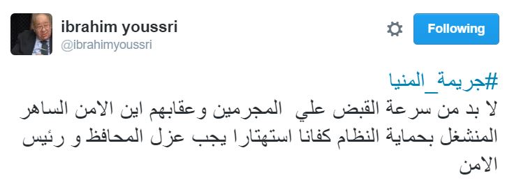 طالب السفير إبراهيم يسري، مساعد وزير الخارجية الأسبق، بإقالة محافظ المنيا اللواء طارق نصر، بعد الأحداث الطائفية التي شهدتها المحافظة.