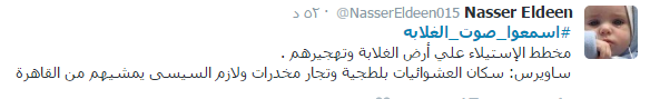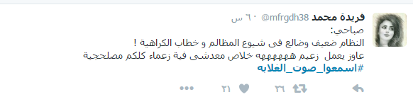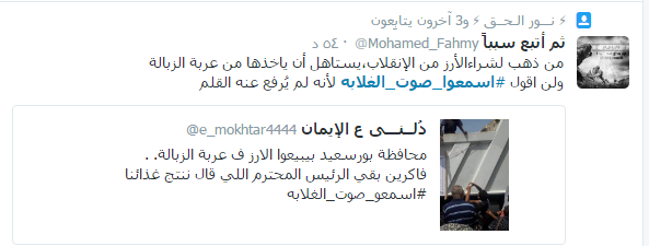 دشن مغردو موقع التدوين المصغر “تويتر” هاشتاج تحت أسم “#اسمعوا_صوت_الغلابه” بالتزامن مع دعوة التحالف الوطني لدعم الشرعية لأسبوع “اسمعوا صوت الغلابة”، وتداول المغردين عبارات تنتقد إدارة نظام السيسي للبلاد، وإدانة عمليات إنتهاك حقوق الإنسان والحريات.