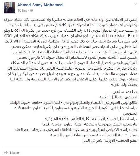 وكتَب على صفحته الشخصية بموقع التواصل الاجتماعي “فيس بوك”، منشورًا لاقى رواجًا كبيرًا، حيث جاء فيه: “أمس تم الإعلان عن أول حالة في العالم مصابه ببكتريا، ولا تستجيب لأي مضاد حيوي وملهاش أي مضاد حيوي -الحاله لامرأة لديها 49 عام تعيش في بنسيلفانيا بأمريكا، وأصيبت بعدوى الجهاز البولي UTI”.