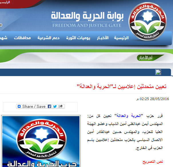 وكان موقع حزب الحرية والعدالة على الانترنت، قد نشر خبر يفيد بأن”حزب “الحرية والعدالة” قرر تعيين كل من: المهندس أيمن عبدالغني والمهندس حسين عبدالقادر متحدثين إعلاميين باسم الحزب في الخارج”.