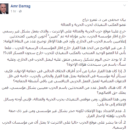 وأشار إلى أنه إذا كان هذا القرار صادرا عن أحد أطراف الخلاف الحالي في جماعة الإخوان، فكيف تستأثر أية مؤسسة فى الجماعة بمثل هذا القرار والخاص بالحزب، خاصة في ظل الدعوات المتنامية لفصل العمل الحزبى التنافسى عن باقي أنشطة الجماعه.