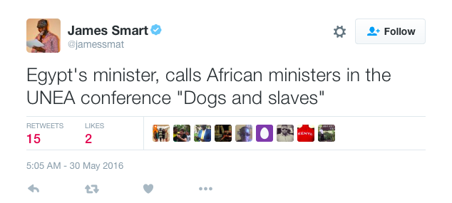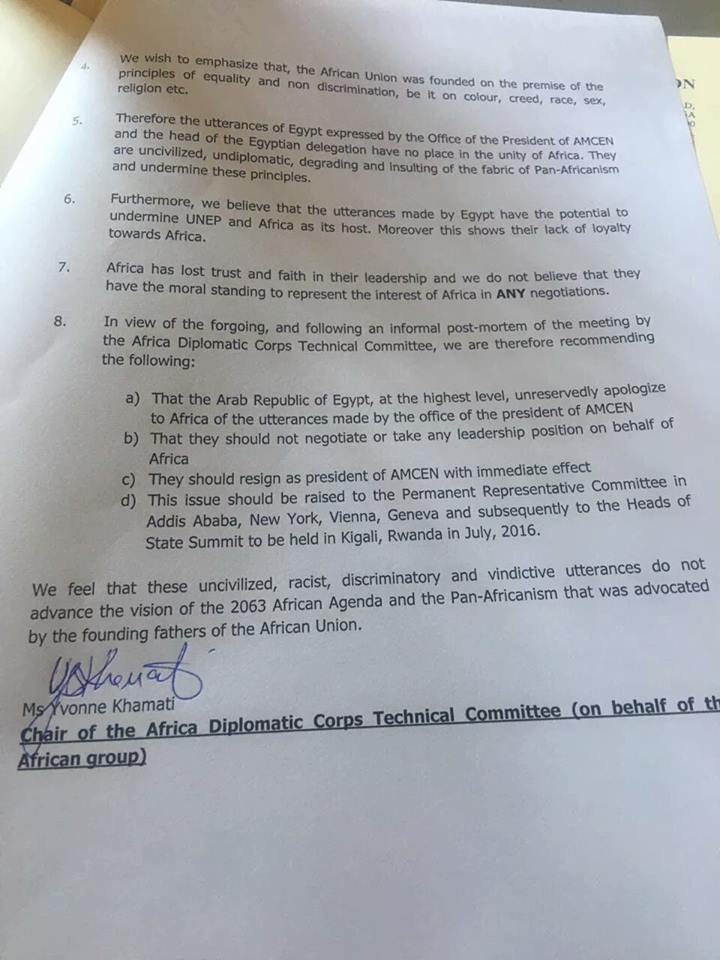 المندوبة الكينية سرعان ما رفعت مذكرة تقدمت بها إلى رئيس البعثات الدبلوماسية الأفريقية، احتجت فيها على نعت رئيس الوفد المصري دول صحراء أفريقيا بـ “الكلاب والعبيد”، متحدثا باللغة العربية، وذلك خلال ترأسه لوفد بلاده في المؤتمر.