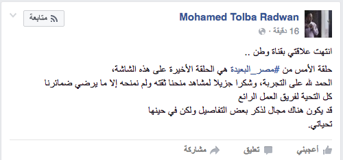 وأضاف -خلال منشور له عبر صفحته الشخصية على موقع التواصل الاجتماعي “فيس بوك”- حلقة الأمس من “مصر البعيدة” هي الحلقة الأخيرة على هذه الشاشة.