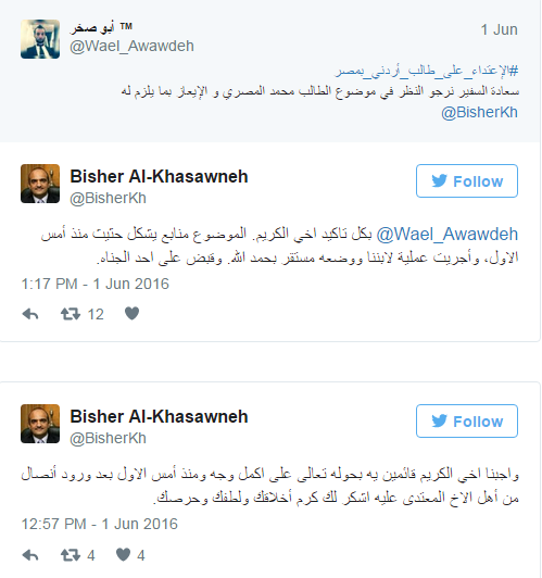 وطلب أحد المغردين من السفير الأردني في القاهرة بشر الخصاونة -الذي نشر تغريدة هنأ فيها وزير الخارجية الأردني ناصر جودة بإعادة تكليفه بوزارة الخارجية في الحكومة الجديدة- بالاهتمام بقضية الطالب الأردني، والذي رد بدوره أنه يتابع القضية.