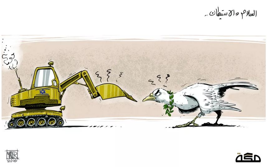 “الاستيطان يحارب السلام”.. كاريكاتير  صحيفة “مكة السعودية”، في إشارة لتجاهل “إسرائيل” الدائم لعمليات السلام واستمرار إنشاء المستوطنات اليهودية.