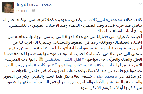 وكتب في تدوينة على حسابه بموقع التواصل الاجتماعي “فيس بوك”: “كان بإمكان ‫‏محمد علي كلاي أن يكتفي بنجوميته كملاكم عالمي، ولكنه اختار أن يناضل ضد حرب فيتنام وضد العنصرية البيضاء وضد الاحتلال الصهيوني لفلسطين، ودفع أثمانًا باهظة جراء ذلك”.