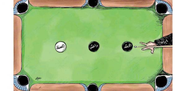 – في الشأن العربي، كان موضوع كاريكاتير “الشرق الأوسط” عن ضرب إيران للسنة عن طريق الحشد الشعبي.