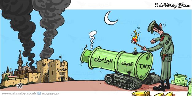 وجه “العربي الجديد” كاريكاتير اليوم إلى أحداث سوريا، فعبر عن أن مدفع رمضان في سوريا من نوع آخر غير الذي يعرفه العالم الإسلامي.