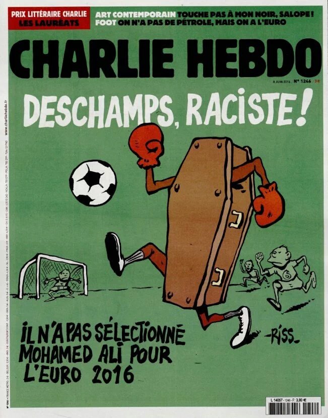 نشرت صحيفة شارلي إيبدو الفرنسية، من جديد، رسمًا عنصريًا يسخر من أسطورة الملاكمة الراحل محمد علي كلاي، ونجم المنتخب الفرنسي كريم بنزيمة.