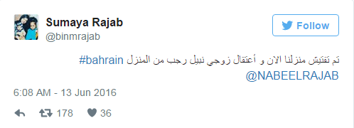 كتبت زوجة رجب في تغريدة علي موقع تويتر: “تم تفتيش منزلنا الآن واعتقل زوجي نبيل رجب من المنزل”.