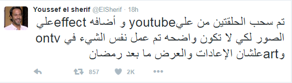 وكتب يوسف الشريف، عبر حسابه علي “تويتر”: “تم سحب الحلقتين من علي “youtube” و إضافة “effect” علي الصور لكي لا تكون واضحة؛ تم عمل نفس الشيء في ontv وart، علشان الإعادات والعرض ما بعد رمضان، وسيعلن اعتذار رسمي في المسلسل نفسه من كل طاقم العمل”.