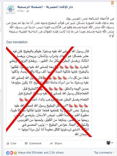 ونشرت دار الإفتاء على صفحتها الشخصية على فيس بوك بيانًا أشارت فيه إلى أنه حتى إن صحَّت فوائد البطيخ العلمية، إلا أن أحاديث الرسول المنشورة على لسانه عارية من الصحة.
