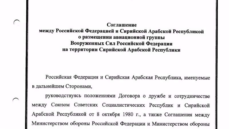 وفي البند الثالث من المادة السادسة جاء أيضًا أن الأعيان المنقولة وغير المنقولة التابعة لمجموعة الطيران الروسية تبقى مصونة بموجب هذا الاتفاق، ولا يحق لممثلي الجمهورية العربية السورية الدخول إلى مكان نشر القوات الروسية بدون اتفاق مسبق.