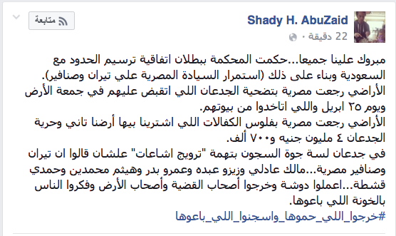 “مبروك علينا جميعا، حكمت المحكمة ببطلان اتفاقية ترسيم الحدود مع السعودية وبناء على ذلك :”استمرار السيادة المصرية علي تيران وصنافير”.