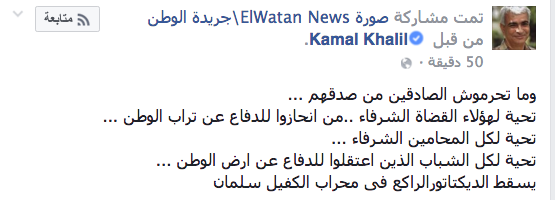 “تيران وصنافير مصرية، بداية كل الشكر والتحية والتقدير لشباب مصر الذى تمسك بتراب الوطن ودافع عن الجزر وتعرض لكل أشكال القمع والسجن”.