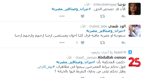 تصدر هاشتاج “تيران وصنافير مصرية” قائمة الأعلى تدولاً على موقع التدوينات الصغيرة “تويتر”، وذلك فور صدور حكم القضاء الإداري ببطلان توقيع اتفاقية ترسيم الحدود بين مصر والسعودية مباشرة.