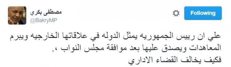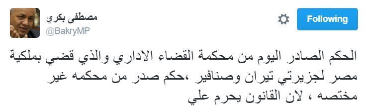 وكتب في تغريدة على موقع “تويتر”، أن “الحكم الصادر اليوم من محكمة القضاء الإداري والذي قضى بملكية مصر لجزيرتي تيران وصنافير، حكم صدر من محكمة غير مختصة، لأن القانون يحرم على القضاء الإداري التعرض لأعمال السيادة ومنها الاتفاقات الدولية والعلاقات الدبلوماسية”.