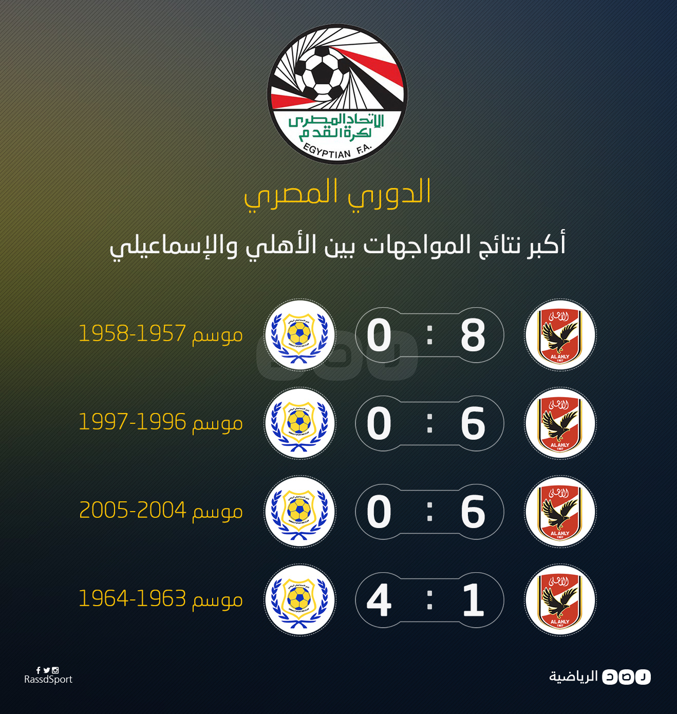 وقبل انطلاق المباراة المنتظرة، نعرض خلال الإنفوجراف التالي أكبر نتائج المواجهات بين الأهلي والإسماعيلي خلال مسيرتيهما في الدوري المصري.