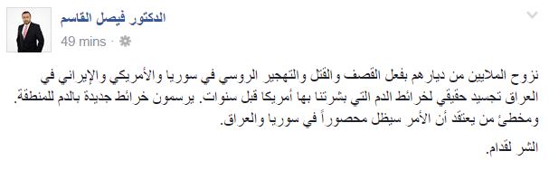 أكد الإعلامي السوري، فيصل القاسم، أنّ نزوح الملايين من ديارهم بفعل القصف والقتل والتهجير الروسي في سوريا والأمريكي والإيراني في العراق، تجسيد حقيقي لخرائط الدم التي بشرتنا بها أمريكا قبل سنوات.