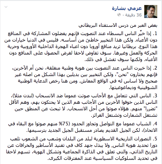 استعرض المفكر الفلسطيني عزمي بشارة ، مدير المركز العربي للأبحاث ما أسماه بعض العبر من درس الاستفتاء البريطاني.