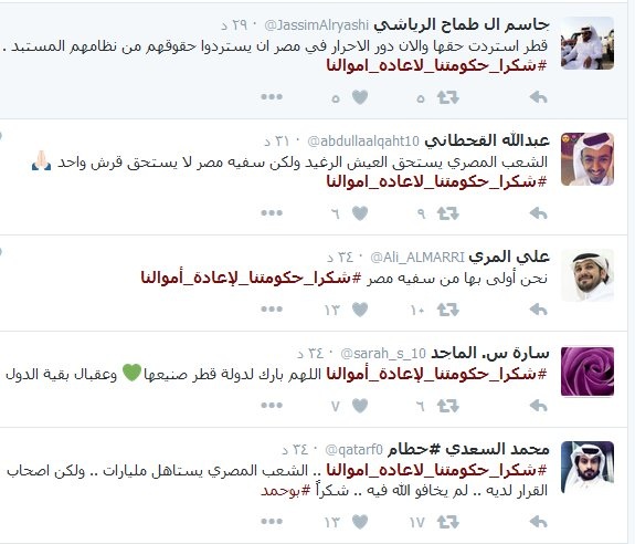احتفى الرأى العام القطري بسداد البنك المركزي المصري مليار دولار مقابل سندات كانت طرحتها مصر في عهد الرئيس محمد مرسى وقام بتغطيتها بنك قطر الوطني،على موقع التواصل الإجتماعي “تويتر”.