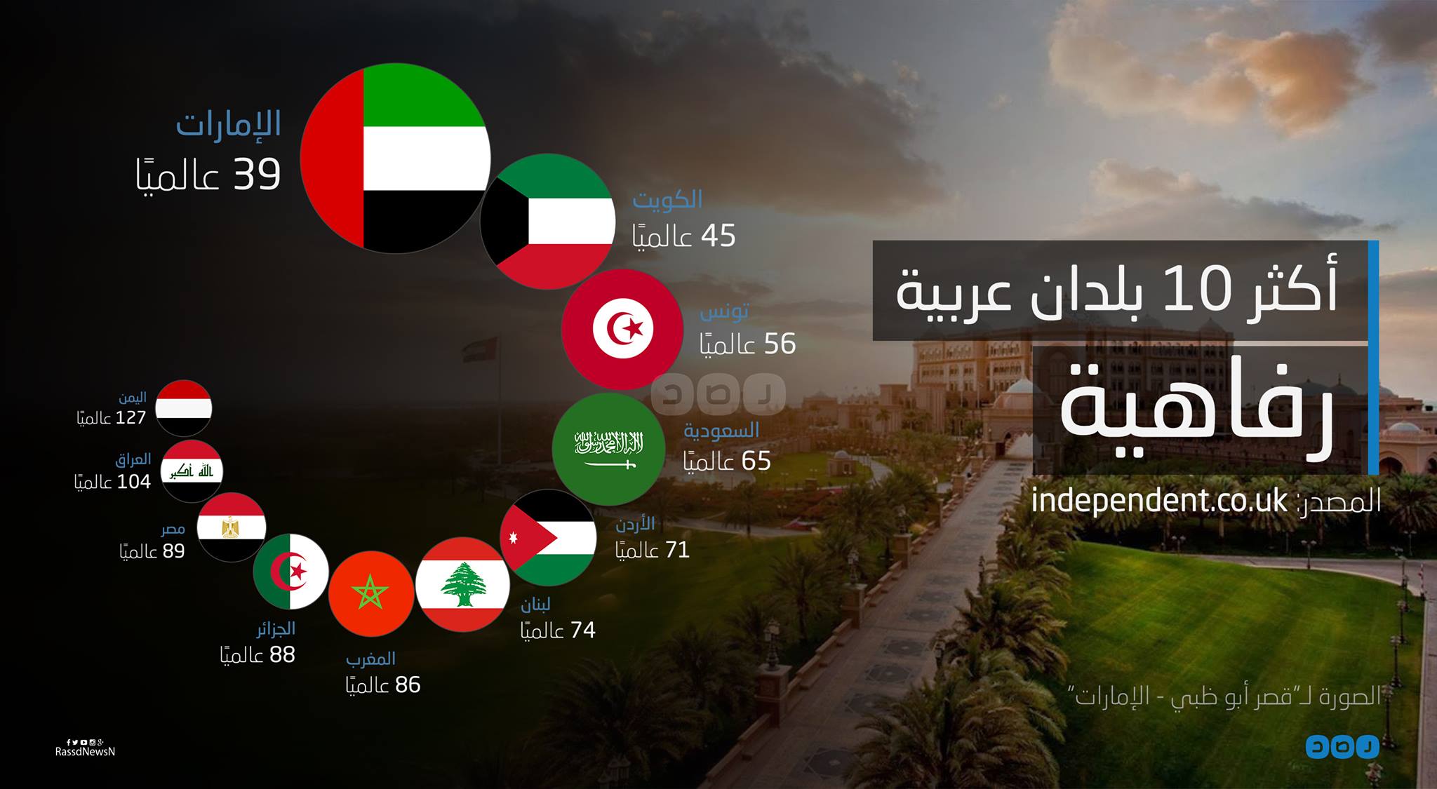 واحتلت الإمارات المرتبة الأولى عربيا ، والـ39 عالميًا ، بينما جاءت مصر في المرتبة الـ89 على مستوى العالم.