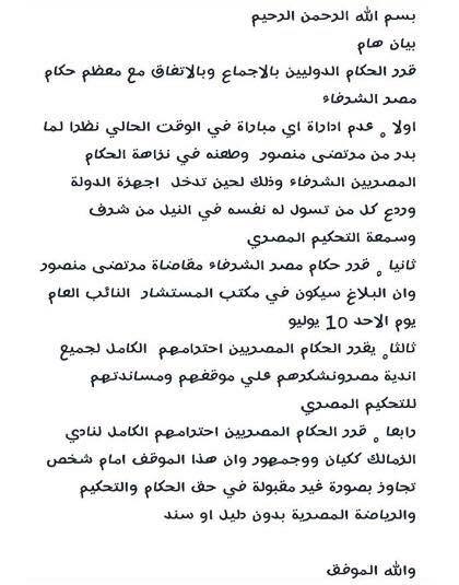 أولًا: عدم إدارة أي مباراة في الوقت الحالي، نظرًا لما بدر من مرتضى منصور وطعنه في نزاهة الحكام المصريين الشرفاء، وذلك لحين تدخل أجهزة الدولة وردع كل من تسول له نفسه في النيل من شرف وسمعة التحكيم المصري.