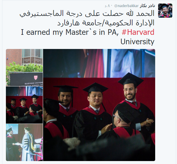 وقال “بكار”،عبر “تويتر”: “الحمد لله حصلت على درجة الماجستير في الإدارة الحكومية من جامعة هارفارد”.