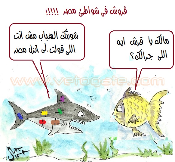 وعن ظهور قروش في شواطئ مصر كان موضوع كاريكاتير “فيتو”
