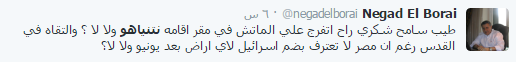 الناشط الحقوقى نجاد البرعي تساءل مستنكرا بقوله “طيب سامح شكري راح اتفرج علي الماتش في مقر اقامه نتنياهو ولا لا ؟ والتقاه في القدس رغم ان مصر لا تعترف بضم اسرائيل لاي اراض بعد يونيو ولا لا؟”.