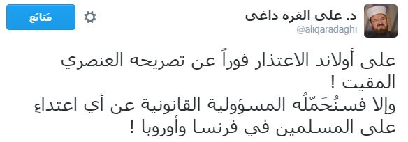 كما حمّل القره داغي، الرئيس الفرنسي مسؤولية أي جريمة ضد المسلمين في فرنسا وأوروبا، قائلًا: “على أولاند الاعتذار فوراً عن تصريحه العنصري المقيت ! وإلا فسنُحَمّلُه المسؤولية القانونية عن أي اعتداءٍ على المسلمين في فرنسا وأوروبا !”.