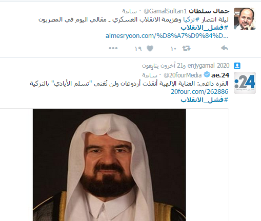 تصدر هاشتاج “فشل الانقلاب” قائمة الأعلى تداولاً على موقع التواصل الاجتماعي “تويتر”، وذلك احتفالاً بفشل عناصر من الجيش التركي في الانقلاب على الحكومة وحزب العدالة والتنمية والرئيس رجب طيب أردوغان.