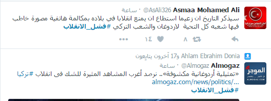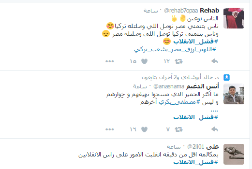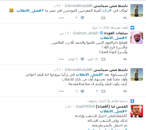 تصدر هاشتاج "فشل الانقلاب" قائمة الأعلى تداولاً على موقع التواصل الاجتماعي "تويتر"، وذلك احتفالاً بفشل عناصر من الجيش التركي في الانقلاب على الحكومة وحزب العدالة والتنمية والرئيس رجب طيب أردوغان.