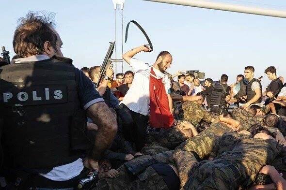 و رصدت صور الأحداث في تركيا معاقبة جموع الشعب للمشاركين في الانقلاب، وتعليقهم على الأعمدة، وتعنيفهم وسلبهم بذتهم العسكرية وأسلحتهم.