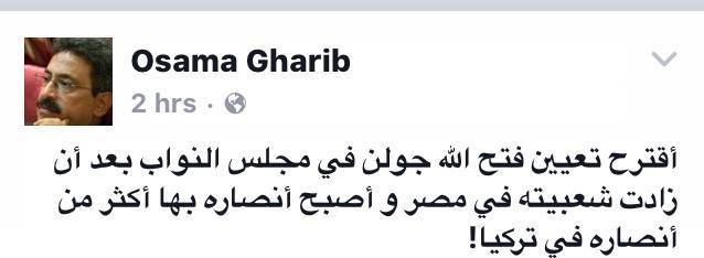 الكاتب الساخر أسامة غريب: “أقترح تعيين فتح الله كولن في مجلس النواب بعد أن زادت شعبيته في مصر وأصبح أنصاره بها أكثر من أنصاره في تركيا”.