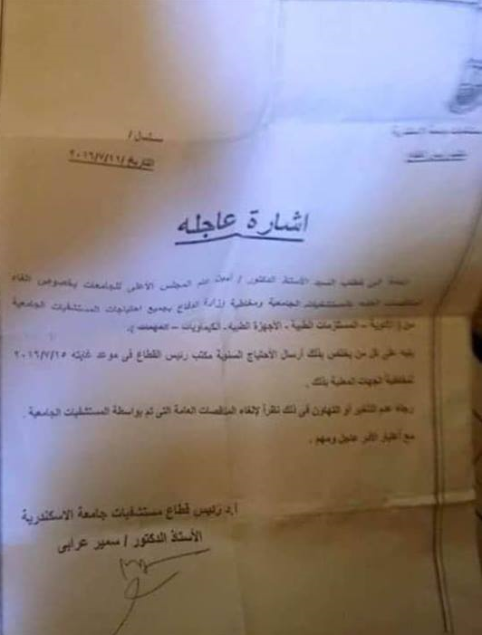 تداول رواد مواقع التواصل الاجتماعي، صورة ضوئية من خطاب يخطر المستشفيات الجامعية التابعة لكلية الطب جامعة الإسكندرية، بتحديد مستلزماتهم من الأجهزة الطبية خلال شهر يوليو؛ ومخاطبة وزارة الدفاع بجميع احتياجات المستشفيات الجامعية.