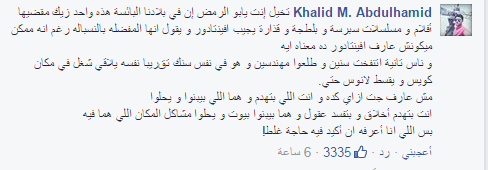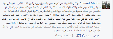 -aHMED :” اولا ربنا يزيدك من نعيمه، بس ليا تعليق ويرجوا ان تتقبل كلامي.. العربيتين دول بحوالي 10 مليون جنيه وانت بتقول انك بتحب تشارك الناس فرحتك..الناس كانت هتفرح بيك اكتر لو بالفلوس دي فتحت جمعية خيرية وتساعد فيها الناس الغلابة ومش لاقية العيش الحاف تأكله لعياله ، ده فيه رجاله بينتحروا علشان مش لاقين شغل ب1500 جنيه.. وكام ارمله مش لاقيه اي دخل ليها ولعيالها الايتام. …”