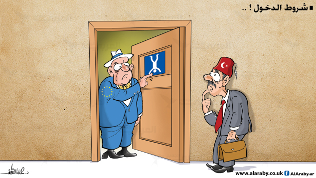 وكان لموقع “العربي الجديد” رأي في العقبات التي تواجه تركيا لدخول الاتحاد الأوروربي ظهر بالكاريكاتير الآتي: