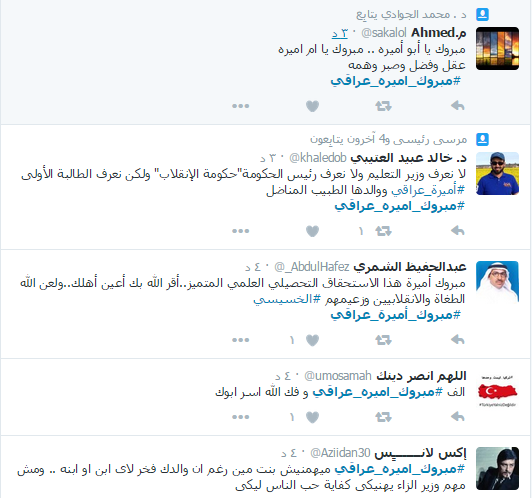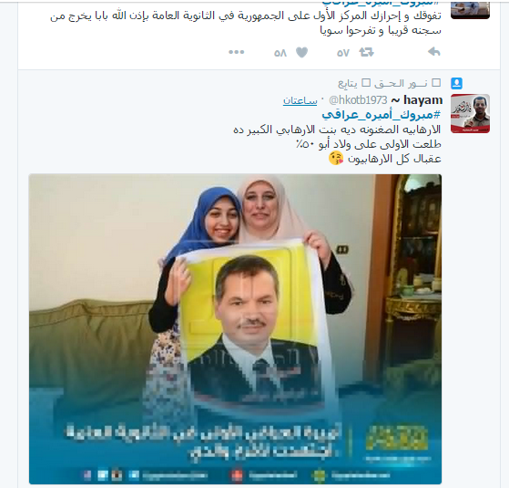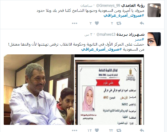 دشن مغردو موقع التدوين المصغر “تويتر” هاشتاج بعنوان”مبروك اميره عراقي” ردا على تجاهل الحكومة ووزير التعليم لتهنئة الطالبة أميرة ابنة العالم والدكتور “إبراهيم عراقى على ” المعتقل والمحكوم علية بالمؤبد في سجون النظام.