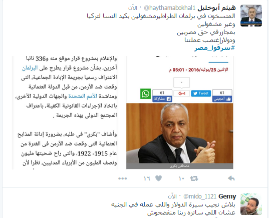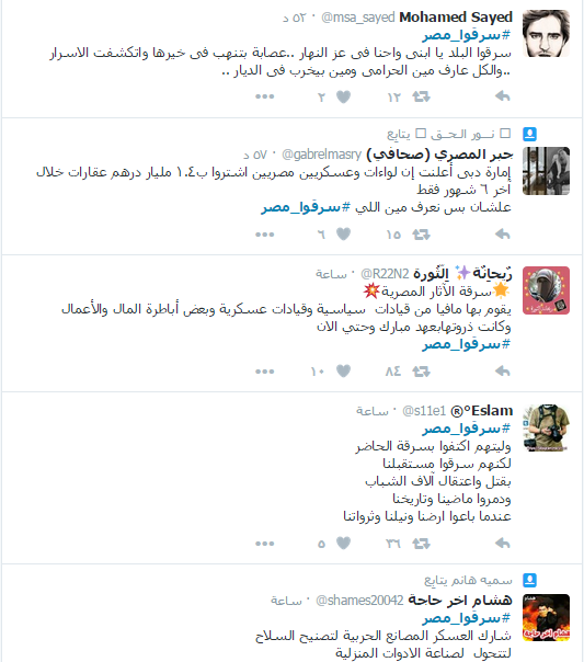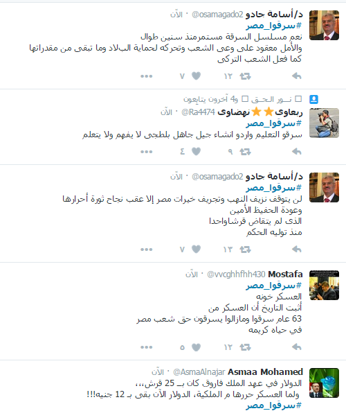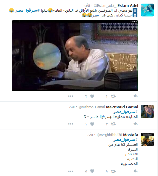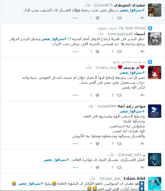 دشن مغردو موقع التدوين العالمي "تويتر" هاشتاج "سرقوا مصر" تنديدا باستمرار سرقة النظام لثروات الشعب المصري وما تبقى من مقدراته، مطالبين الشعب المصري بالتصدي للنظام الذي يتحكم بمصائرهم.