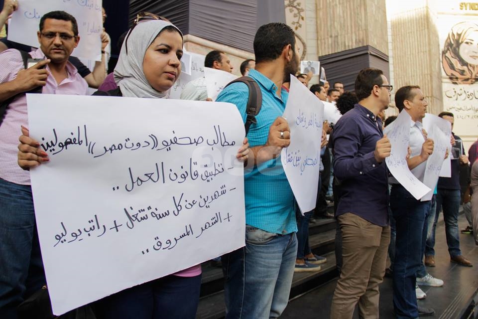 نظم عدد من صحفيي موقع دوت مصر المفصوليين تعسفيًا مؤخرًا وقفة احتجاجية على سلالم نقابة الصحفيين، مساء اليوم، رفضًا لقرار فصلهم وللمطالبة بحقوقهم التي ينص عليها قانون العمل في حال فصل أي شخص يعمل بؤسسة تابعة له.