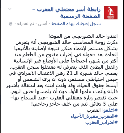 وأضافت الصفحة: ابنته ولدت بعد اعتقاله بأشهر قليلة وأتمت عامها الأول دون أن يلمسها حتى اليوم؛ حيث تقتصر زيارة معتقلي العقرب -عند السماح بها- على 5 دقائق تتم من خلف حاجز زجاجي.