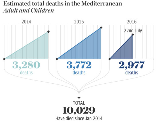 ووفقًا للمنظمة الدولية للهجرة، وقد وصلت 225095 المهاجرين واللاجئين في أوروبا عن طريق البحر حتى الآن هذا العام، وكانت هناك 2889 حالة وفاة في المتوسط مقارنة مع 1838 في الأشهر الستة الأولى من 2015م.