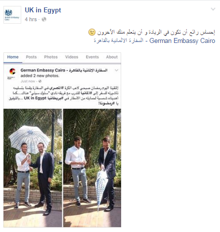 وأعادت السفارة البريطانية نشر صور صبحي في السفارة الألمانية وعلقت عليها قائلة: “إحساس رائع أن تكون في الريادة وأن يتعلم منك الآخرون”.