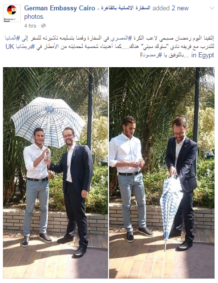 في البداية، نشرت صفحة السفارة الألمانية الرسمية، اليوم الإثنين، صورة للاعب رمضان صبحي مع السفير وهو يسلمه تأشيرة دخول ألمانيا للحاق بمعسكر فريقه “ستوك سيتي”، وأهدته السفارة هدية عبارة عن “مظلة أمطار”.