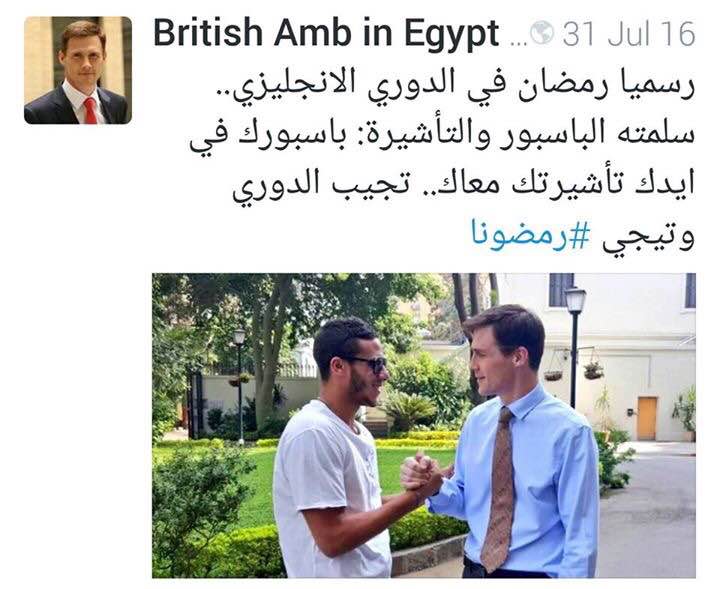 وكان السفير البريطاني بالقاهرة، جون كاسن، قد نشر مؤخرًا صورًا تجمعه بصبحي خلال إجراءات حصوله على التأشيرة وعلق عليها بدعابة قائلًا: “باسبورك في جيبك تأشيرتك معاك تجيب الدوري وتيجي”.