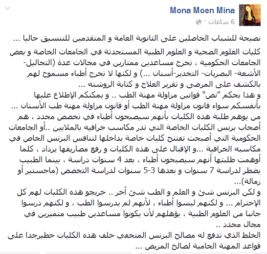 وقالت مينا، في تدوينة لها عبر موقع التواصل الاجتماعي “فيس بوك”، “نصيحة للشباب الحاصلين على الثانوية العامة والمتقدمين للتنسيق حاليًا، كليات العلوم الصحية والعلوم الطبية المستحدثة في الجامعات الخاصة وبعض الجامعات الحكومية تخرج مساعدين ممتازين في مجالات عدة (التحاليل- الأشعة- البصريات- التخدير- أسنان …الخ)، ولكنها لا تخرج أطباء مسموحًا لهم بالكشف على المرضى وتقرير العلاج وكتابة الروشتة وهذا بحكم نص قوانين مزاولة مهنة الطب، ويمكنكم الاطلاع عليها بأنفسكم سواء قانون مزاولة مهنة الطب أو قانون مزاولة مهنة طب الأسنان.