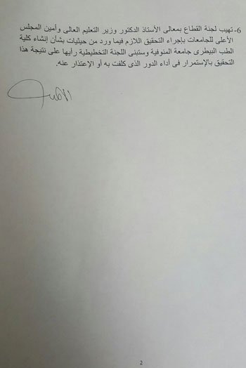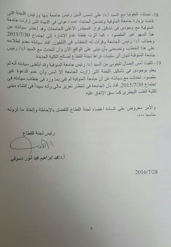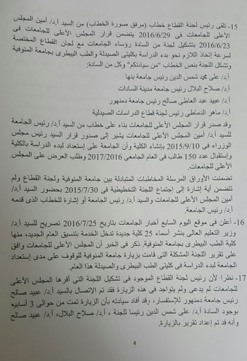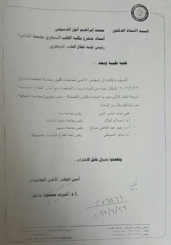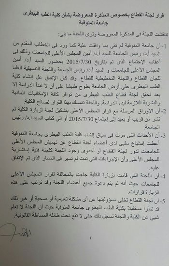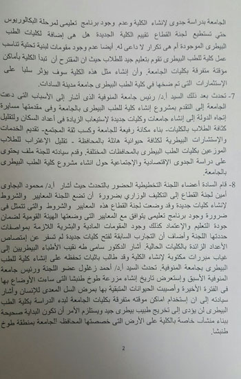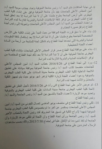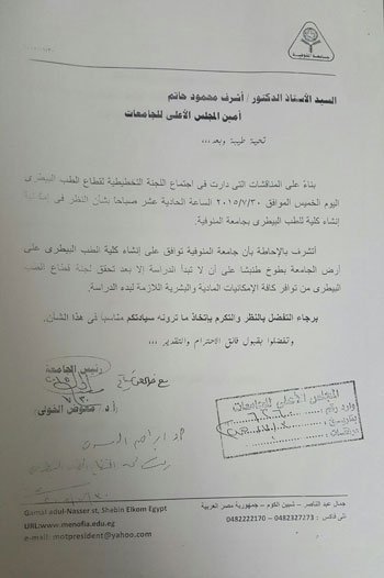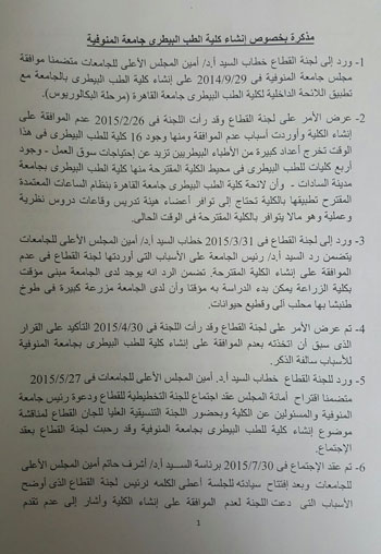 وبحسب المستندات فإن :” لجنة قطاع الطب البيطرى، تلقت خطابا من الدكتور أشرف حاتم أمين المجلس الأعلى للجامعات، لإعلامها بقراره بتشكيل لجنة من القطاع المختص لدراسة إمكانية بدء الدراسة بكلية الطب البيطرى بجامعة المنوفية، على أرض الجامعة بطوخ طنبشا، بعد تلقيه قرار الموافقة من مجلس الجامعة بإنشاء كلية للطب البيطرى.