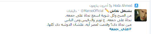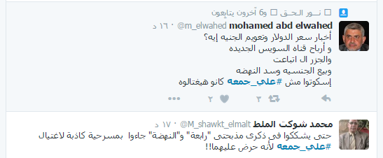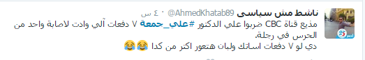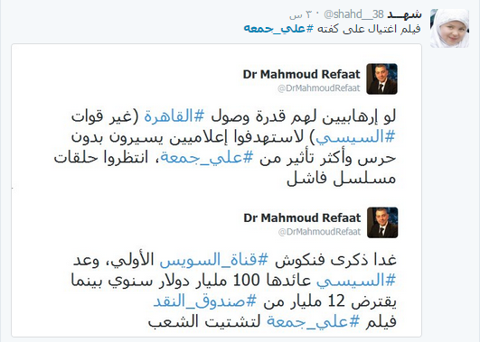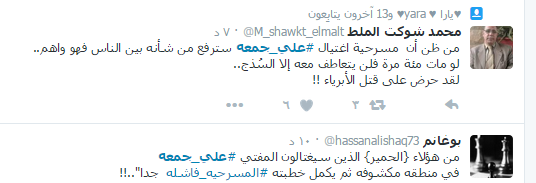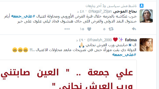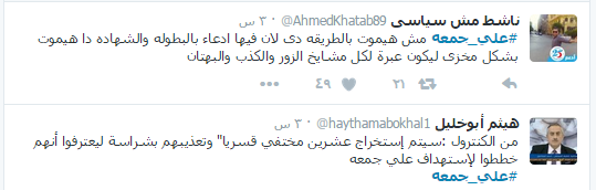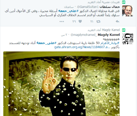 وجاءت تغريدات رواد موقع التواصل الاجتماعى “تويتر” منها المتعاطفة مع جمعة والعديد منها يعتبر المحاولة مسرحية مدبرة من قبل النظام.